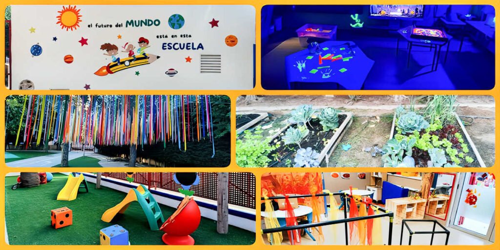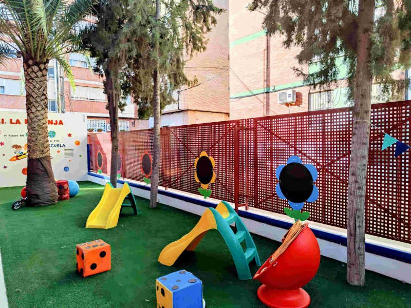 Las instalaciones también acompañan este trabajo educativo. El colegio dispone de un patio amplio con zonas de sombra, arenero, toboganes y una pequeña zona de educación vial donde los niños aprenden jugando. Las aulas cuentan con recursos digitales y el centro dispone también de espacios multimedia para actividades educativas.