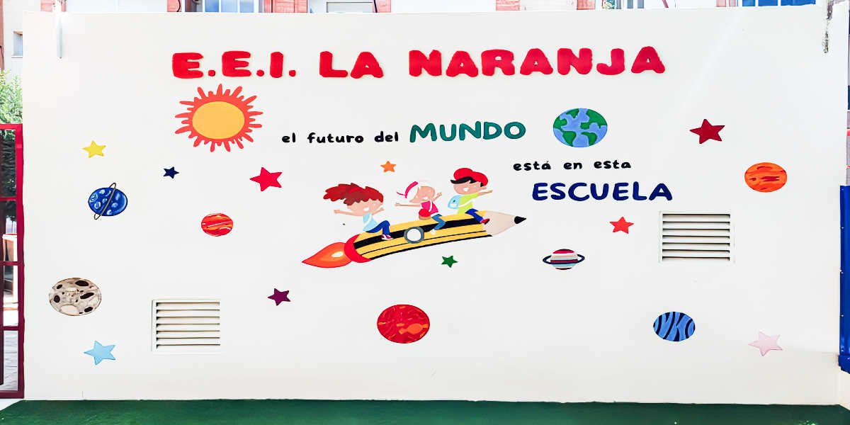• Lona decorativa de la Escuela Infantil La Naranja de Beniaján con dibujos infantiles y el nombre del centro.