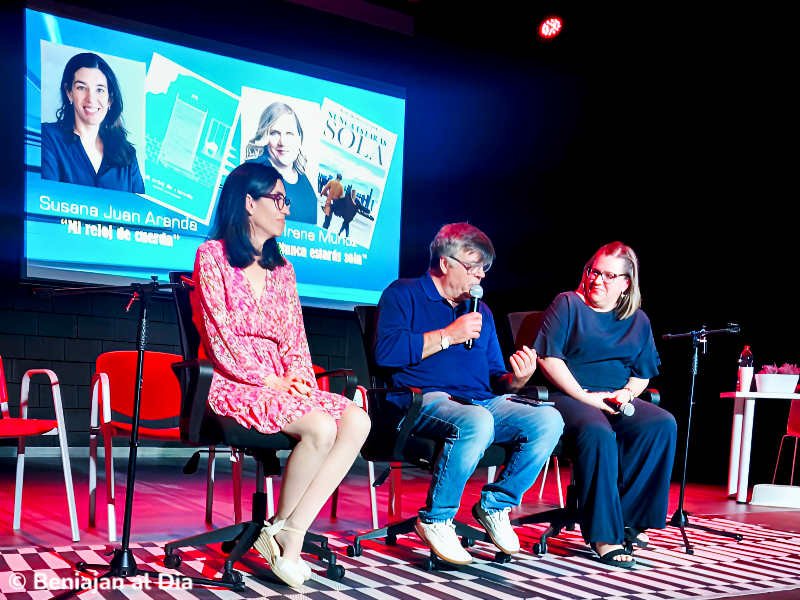 • Pepe Leal junto a las escritoras Susana Juan e Irene Muñoz durante la tertulia de la I Fiesta del Libro de Beniaján 2026 en el escenario del Centro Cultural.