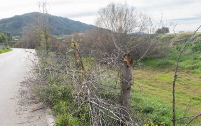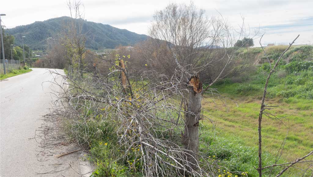• Rama y árboles partidos en el cauce de la Rambla del Garruchal, Beniaján, tras su caída; tramo afectado sobre el que el pedáneo ha enviado solicitud de actuación a la Confederación Hidrográfica del Segura.