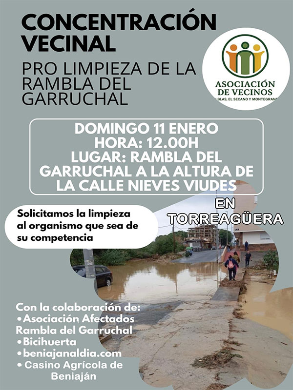 Este domingo, la Asociación de Vecinos de San Blas, el Secano y Montegrande de Torreagüera nos convoca para expresar un «BASTA YA». Y lo hace sin exclusiones. Esto va de vecinos de uno y otro pueblo; de nuestra seguridad y de la salud pública. La Rambla del Garruchal no solo no cumple con su función de canalizar el agua cuando llueve, sino que se ha convertido en un foco inmundo de mierda, digámoslo claro.
